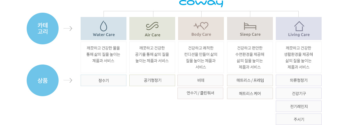 코웨이는 단순히 제품만 판매하는 것이 아니라 제품과 서비스의 결합을 기반으로 'Care'를 제공하는 것이 핵심 경쟁력이라고 할 수 있습니다. 그리하여 'Care'의 가치를 명확히 반영하고, 코웨이의 다양한 제품과 서비스에 대한 쉽고 빠른 이해를 돕기 위해 코웨이는 기업 브랜드이자 대표 브랜드인 Coway를 중심으로 5개의 'Care' 카테고리 아래 제품군을 조직화하여, 보다 전문적이고 체계적인 제품과 케어서비스를 경험하도록 하였습니다.