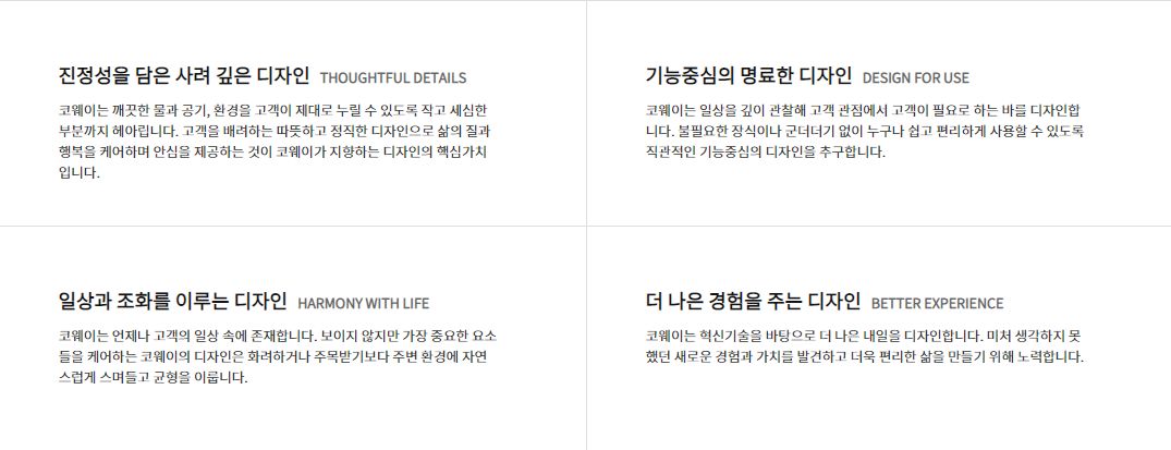 물과 공기 등 생명을 위한 가장 기본적인 요소를 다루는 코웨이는 불필요한 장식을 최대한 배제하고 본질을 디자인합니다. 디테일 요소 하나하나에도 이유가 있는 디자인, 일상과의 조화, 쉽고 편리한 사용성으로 새로운 경험을 전달하는 것. 이것이 코웨이가 생각하는 좋은 디자인입니다.