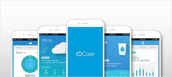 코웨이는 코웨이를 경험할 수 있는 모든 분야에서 코웨이만의 감성과 브랜드 가치를 전달하기 위해, 제품 디자인은 물론 서비스 매체 및 브랜드 공간, 스마트폰 어플리케이션에도 사용자를 배려하는 디자인을 제시합니다. 특히 그동안 눈으로 확인할 수 없었던 공기질 및 물 음용습관을 직관적으로 전달한 아이오케어(IoCare) 어플리케이션은 스토리텔링 형식의 화면 구성과 깔끔한 사용자 환경을 인정받아 iF, 일본 굿디자인 및 국내 3대 디자인상 중 하나인 핀업 디자인 어워드를 수상하며 새로운 삶의 가치를 제공했습니다.