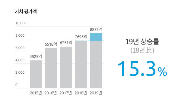 이 조사는 포춘(Fortune)이 2015년에 선정한 국내 500대 기업을 대상으로 진행되었으며, ‘재무분석예측’, ‘브랜드역할지수’, ‘브랜드강도’ 등 3가지 핵심 요소를 중심으로 한 인터브랜드 자체 브랜드 가치 평가 모델을 기준으로 선정됩니다. 코웨이는 2018년 대비 브랜드가치 상승률이 15% 이상 증가하여 50대 브랜드 중 브랜드 가치 상승률이 가장 높은 브랜드(Top Growing Brands)로 선정되었습니다. 코웨이는 앞으로도 객관적이고 공신력있는 브랜드 가치 진단을 통해 매년 성장하는 브랜드가 되도록 노력하겠습니다.