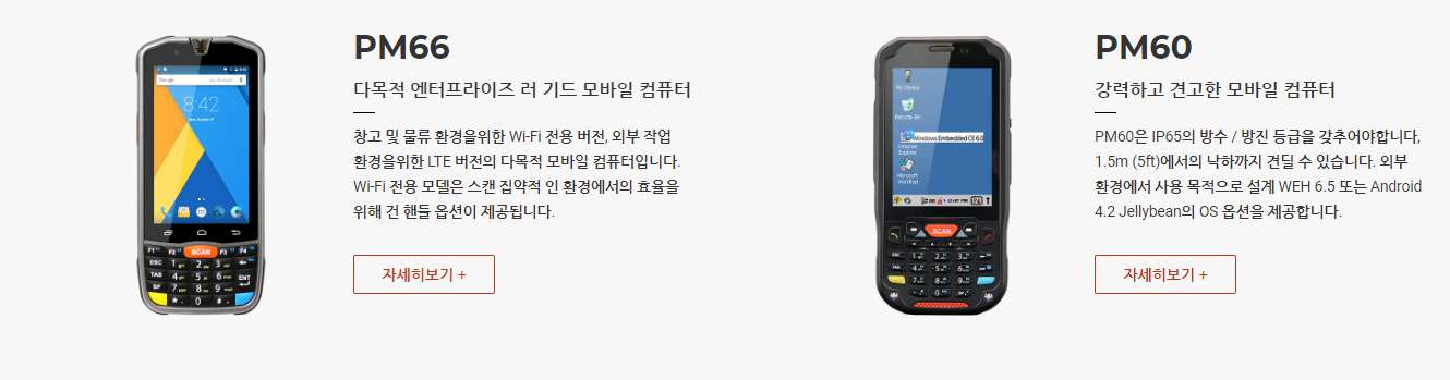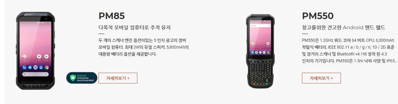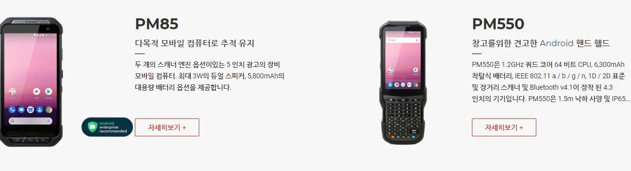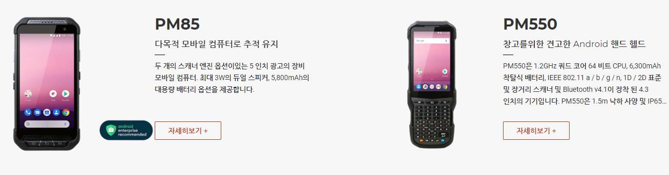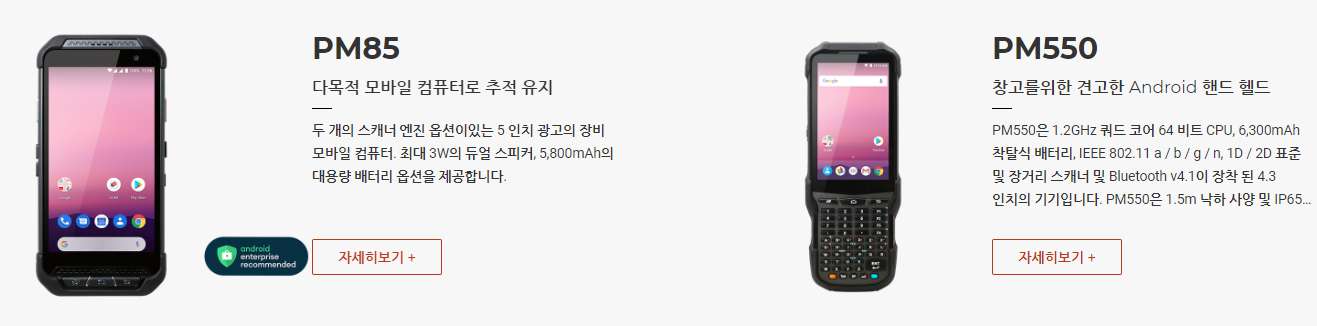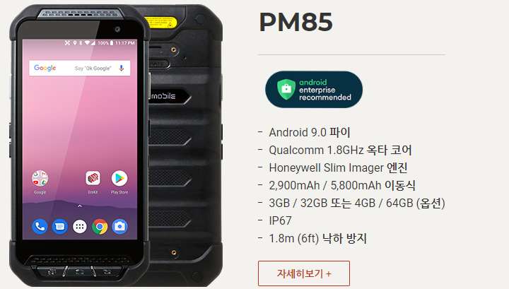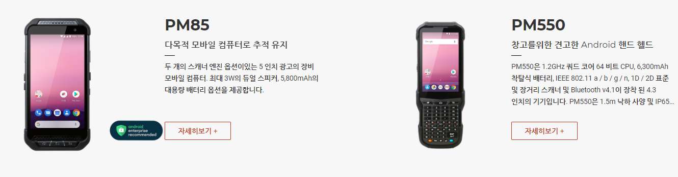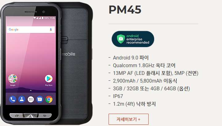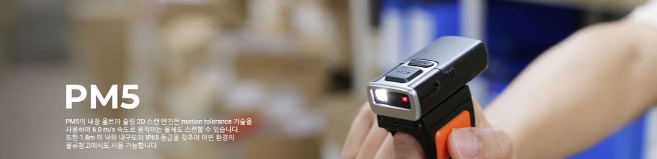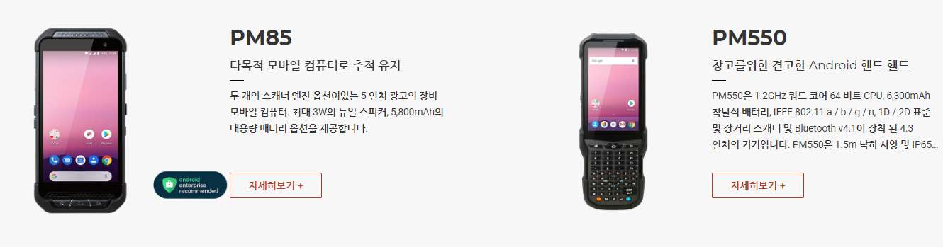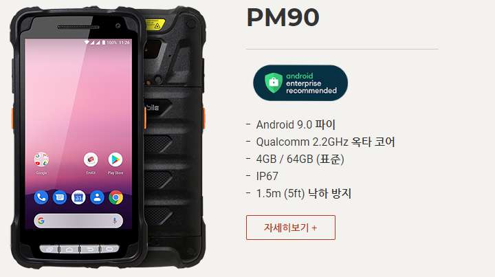 PM550은 1.2GHz 쿼드 코어 64 비트 CPU, 6,300mAh 착탈식 배터리, IEEE 802.11 a/b/g/n, 1D/2D 표준 및 장거리 스캐너 및 Bluetooth v4.1이 장착 된 4.3인치 디스플레이의 기기 입니다. PM550은 1.5m 낙하 사양 및 IP65 방수/방진 보호 등급의 견고한 단말기입니다.