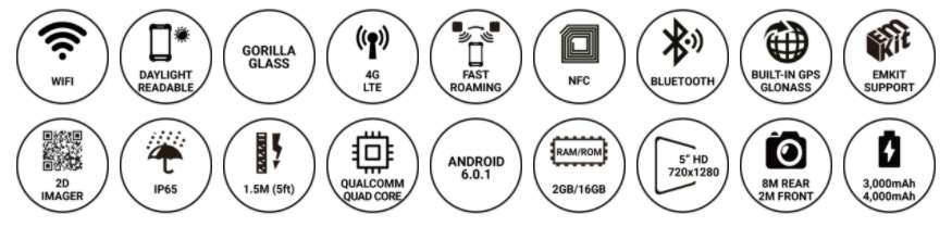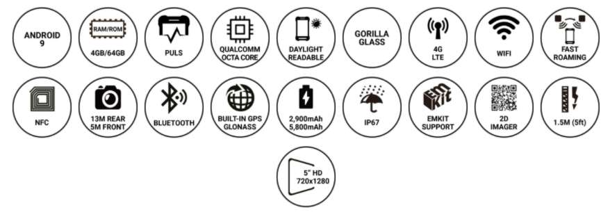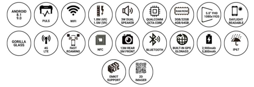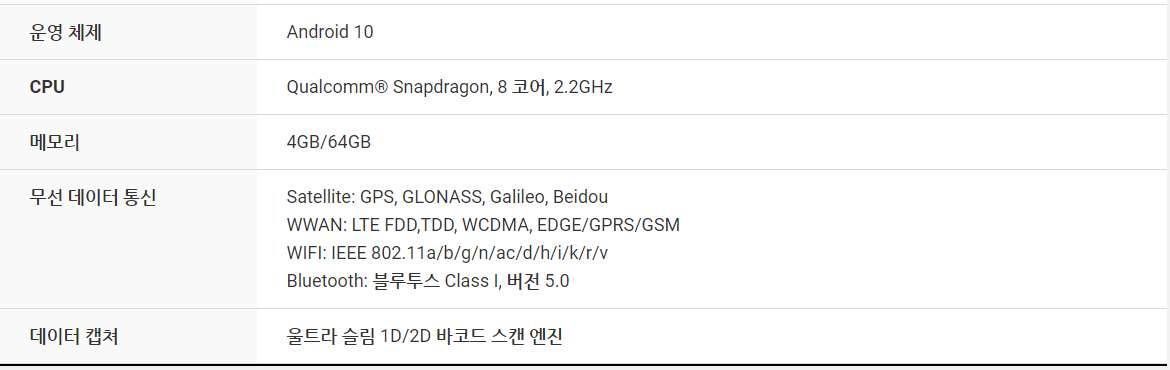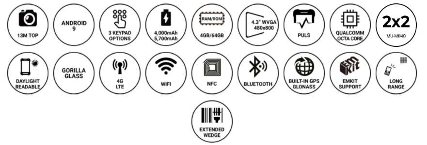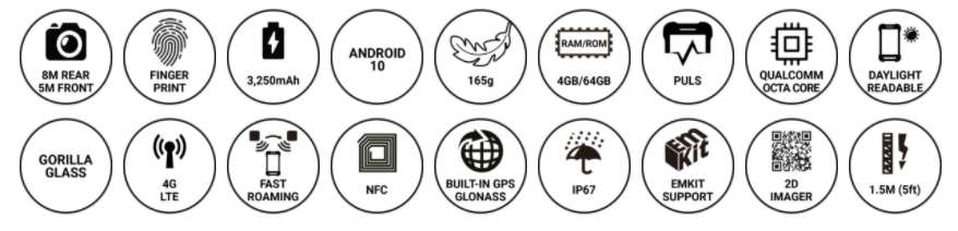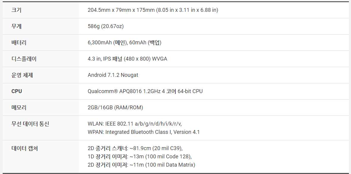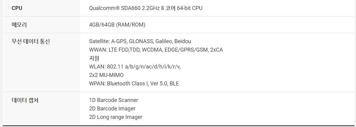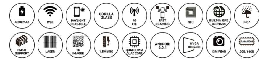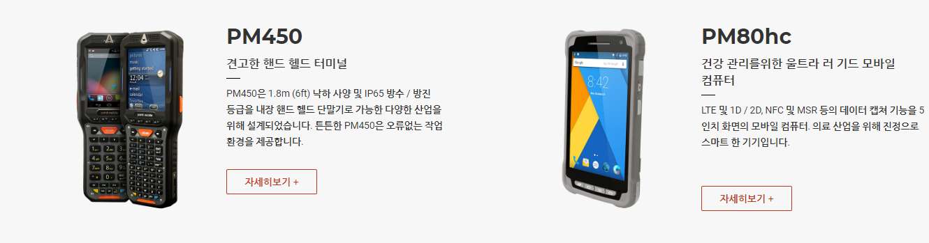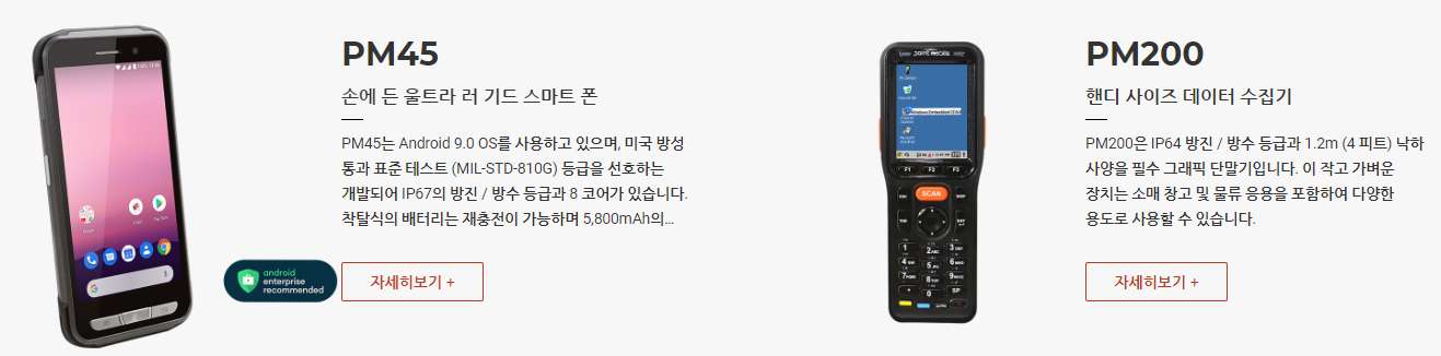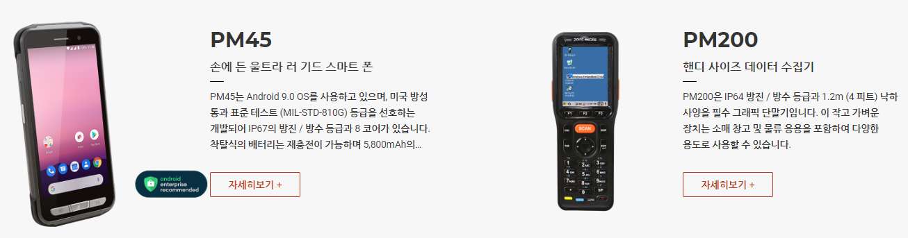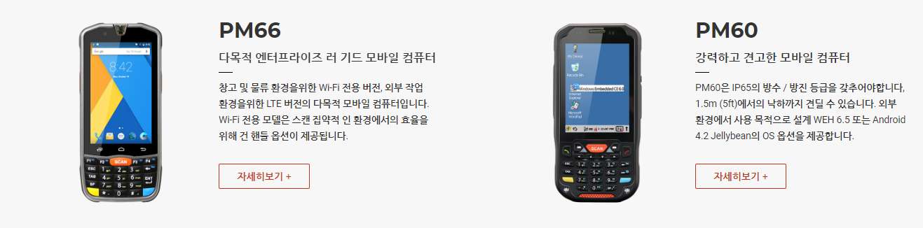 PM550은 1.2GHz 쿼드 코어 64 비트 CPU, 6,300mAh 착탈식 배터리, IEEE 802.11 a/b/g/n, 1D/2D 표준 및 장거리 스캐너 및 Bluetooth v4.1이 장착 된 4.3인치 디스플레이의 기기 입니다. PM550은 1.5m 낙하 사양 및 IP65 방수/방진 보호 등급의 견고한 단말기입니다.