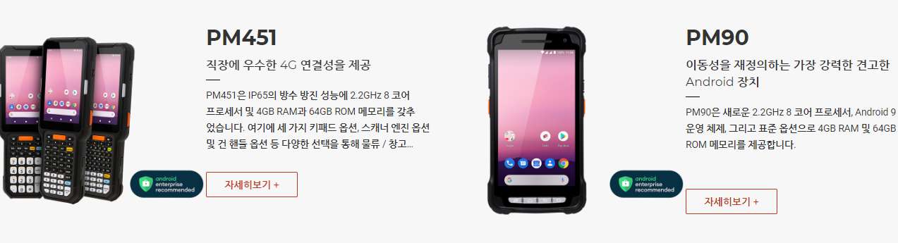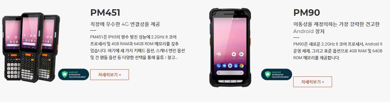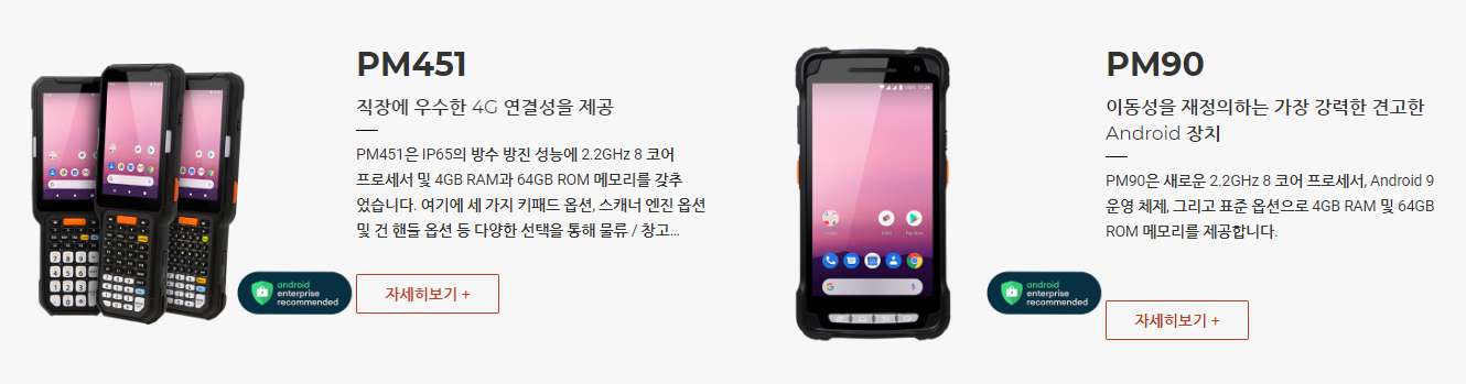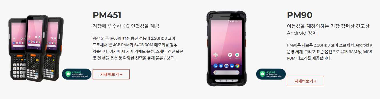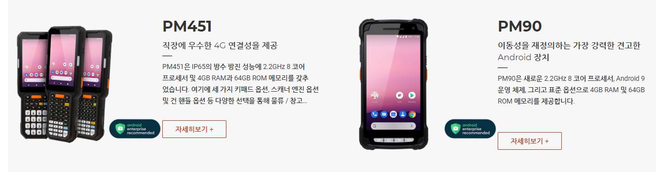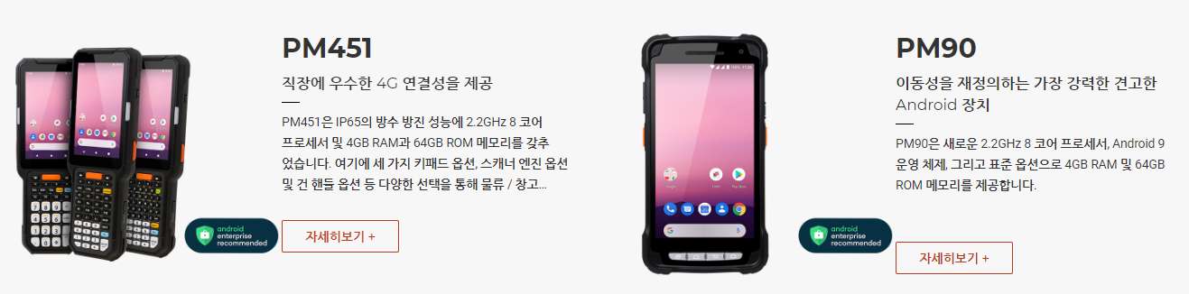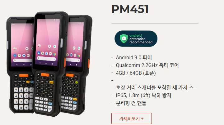 PM451은 IP65의 방수방진 성능에 2.2GHz 8코어 프로세서 및 4GB RAM과 64GB ROM메모리를 갖추었습니다. 여기에 세 가지 키패드 옵션, 스캐너 엔진 옵션 및 건핸들 옵션 등 다양한 선택지를 통해 물류/창고 작업에 완벽한 기기로 탄생하였습니다.