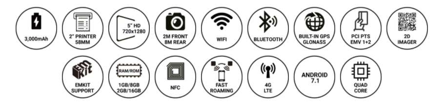 PM500은 엔터프라이즈 모빌리티 시장을 위해 설계된 사용자 맞춤형 Enterprise Mobility Kit (EmKit)와 같은 포인트모바일의 부가가치 서비스 키트 및 Android 7.1을 지원하는, 모든 리테일 시장 및 적용 분야에 완벽한 솔루션입니다. 실내, 실외 구분 없이 어디에서나 활기차고 다채로운 데이터를 보여주는 LED 백라이트의 크고 밝은 5인치 디스플레이 패널을 활용하십시오. 터치스크린을 통해 고객의 서명을 쉽게 받을 수 있으며, 내장된 2인치 열 전사 프린터는 지체 없이 영수증을 인쇄합니다.