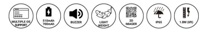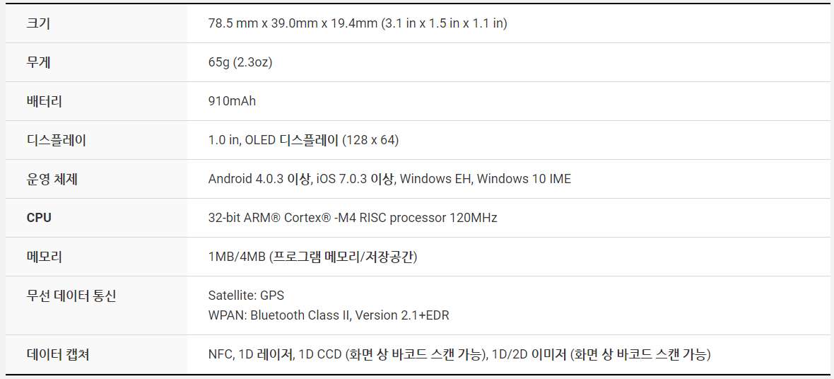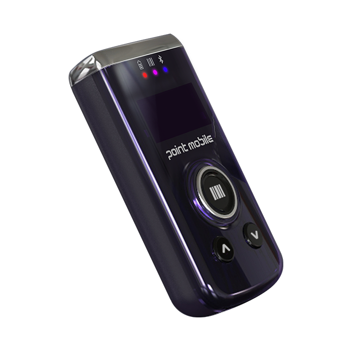 에너지 효율이 높고 BLE를 지원하는 블루투스 v4.2를 탑재하여 작은 크기에도 불구하고 최대 8시간 동안 충전 없이 사용이 가능합니다. 또한 빠르고 지연 없이 데이터를 포인트모바일의 다른 모바일 컴퓨터로 전송할 수 있습니다.